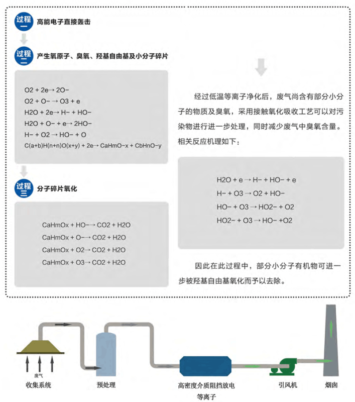 在外加电场的作用下,介质放电产生的大量携能电子轰击污染物分子,使其电离、解离和激发,然后引发了一系列物理、化学反应,是大分子污染物转变为简单小分子安全物质,或使有毒物质转变为无毒无害或低害低毒物质,从而使污染物异味得以降解去除。因其电离后产生的电子平均能量在1eV~10eV,适当控制反应条件可以实现一般情况下难以实现或速度很慢的反应变得十分快速。